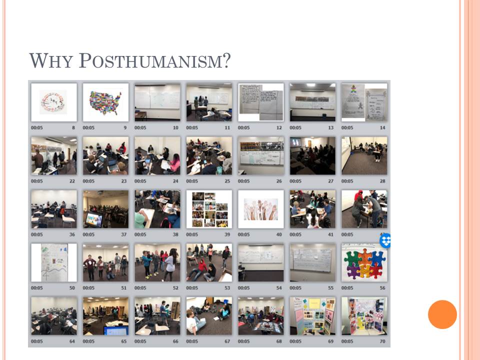 The materiality of this classroom tells a humanist story: in here, you’re an any-one coming into an any-where to learn an any-thing. Responsible and purposeful observation with posthumanist theory can help us not only read/recognize those stories but disrupt them: to teach elsewhere and tell different stories with our students and each unique and unrepeatable classroom they create.