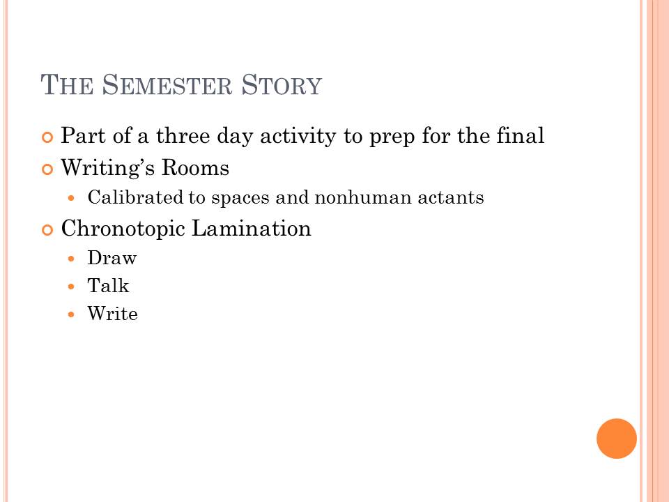 The Semester Story was a three-day, multimodal activity (in preparation for the Final Exam) that I first created/deployed in a non-survey, non-major American Literature course (17 students) in Spring 2018. Its curation started with two writing process research studies (re)calibrated via posthumanism and has become just one concrete strategy/assignment in my toolbox that not only helps me more ethically and responsibly observe and assess the classroom as a whole but also offers students the chance to research and assess their own learning and growth–the story of their semester–using data they’ve been creating and curating for months. The Semester Story played a huge role in my dissertation and is, to my mind, a practical distillation of what teaching elsewhere can be. The below recording was my first time presenting on this assignment (March 2020) outside of my defense and offers a (very) brief introduction to the concept of it, particularly the two composition studies articles it started from.